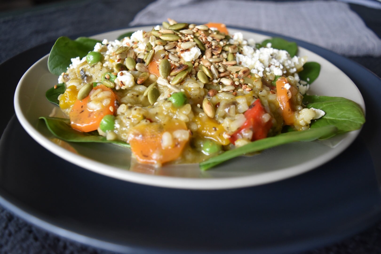 - When risotto finishes cooking, rest it in the bowl for 5 minutes. Serve topped with crumbled feta and toasted seeds.